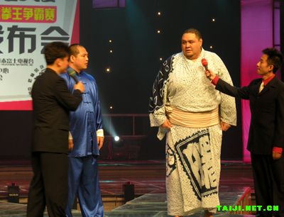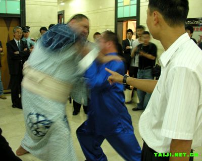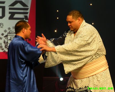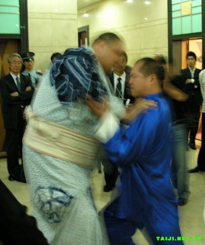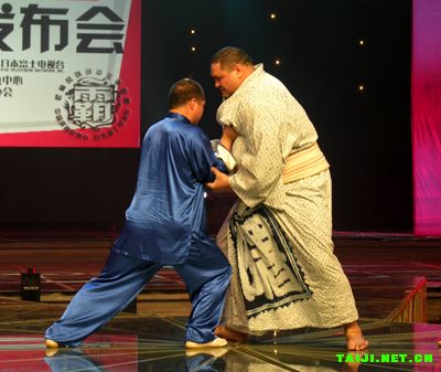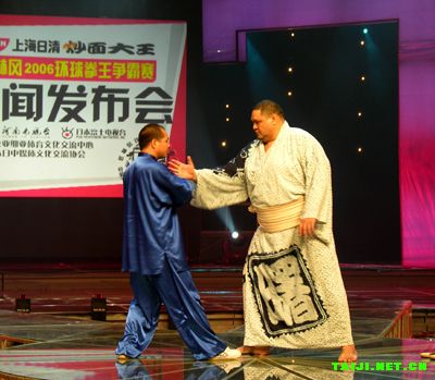 2006年6月10日,由河南电视台与日本富士电视台联合主办,北京亚细亚体育文化交流中心、日本日中媒体文化交流协会协办的“上海日清”2006武林风环球拳王争霸赛在河南省体育馆举行,来自陈家沟的太极高手王战军接受日本相扑最高级别(横纲)曙太郎的挑战,根据规则,双方定步推,动者为输,可以摔。第一回合,双方搭手划圈,王战军弓步站立,双方在顶劲20秒后,只见王战军腰一松,一个?劲,将曙太郎摔倒在地;第二回合,双方硬顶,只见王战军合住劲,任凭身高2.03米,体重223公斤的曙太郎推,纹丝不动,曙太郎累得头上冒汗。最后他说:太极拳厉害!