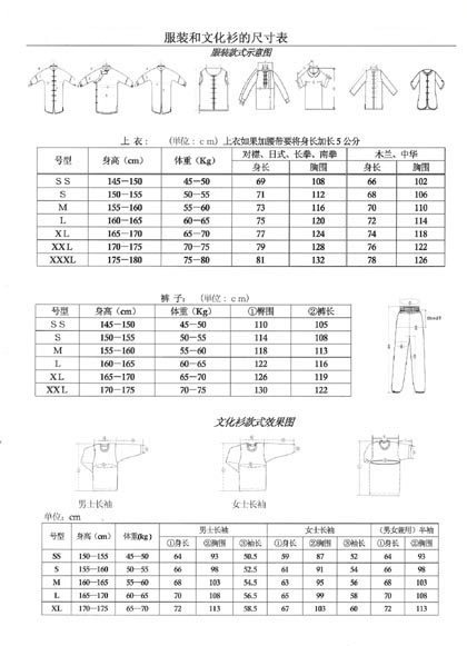 凡在本店订做的服装,请注明尺寸信息(紧身尺码),通常服装我们会按照一定比例放大(武术练功服)。
