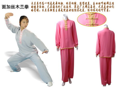**宝贝说明(木兰拳)**木兰拳作为一项是武舞相融,刚柔相继,造型优美,乐曲动听的群众性的健身活动,已在海内外广泛流传,深受广大群众喜爱,尤其是女士们的青睐。木兰拳服装主要是突出女性阴柔之美,练功休闲均可穿着。
