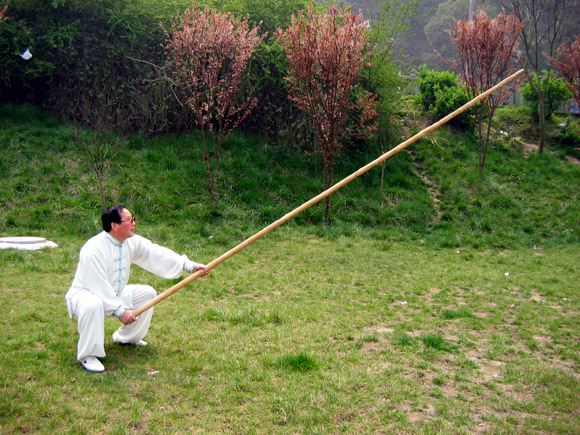 过去有前辈常说:刀练臂、剑练腕、大枪练丹田,这话有道理。器械练习是增长内家功夫的重要途径,阎志高师爷用的大铁剑有10来斤,刀和杆子都有10多斤重。我见过有抖大杆子的练家,在杆头上捆上沙包以增加重量。其实抖大杆子还有——个鲜为人知的好处就是当你心情不好的时候,一定要多抖—-抖大杆子。腊木杆反复磨擦劳宫穴,心火自然消失,如得真传再结合丹田气的运转练习,抖过100下后,五脏六腑如同三伏天饮用了冰镇果汁的感觉,什么烦恼、愤怒、沮丧和抑郁都会烟消云散。