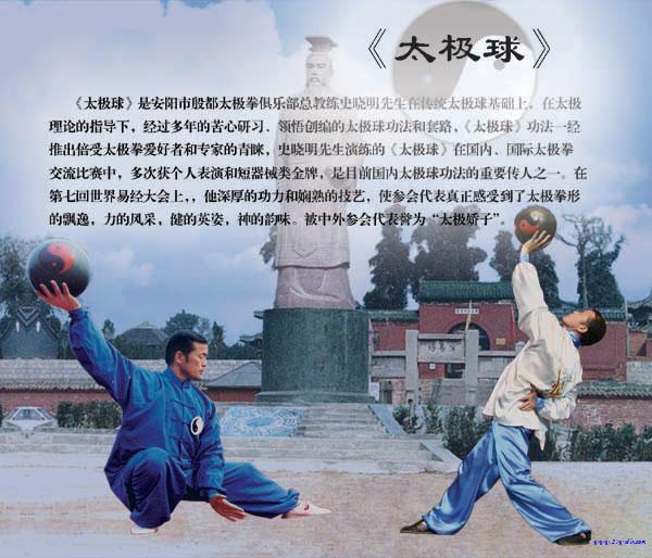 太极球功法是太极拳体系里一个重要的组成部分,是太极内功修炼的高层功夫,历代太极拳高手对此功法都是喜爱备至并且苦练不辍,长期以来其功法套路和秘诀承传隐秘、更是不肯轻易示人,如今能真正了解和掌握太极球功法的人寥寥无几。 长期以来,太极球功法被人为地披上了神秘的面纱,使许多太极拳爱好者可望而不可知,著名武术家安阳市殷都太极拳俱乐部总教练史晓明先生在传统太极球基础上,在太极理论的指导下,经过多年的苦心研习、领悟创编的太极球功法和套路,揭开了太极球的神秘面纱,《太极球》教学光盘一经推出倍受太极拳爱好者和专家的青睐,史晓明先生用最简练朴实的语言在中华文明的发祥地殷墟用90分钟时间向大家完整的讲述了《太极球》的基本功法和套路,使人一目了然。他的讲述使人顿开茅塞,他在中华文明的发祥地殷墟的演练,给人一种天人和一的美,给人一种气势磅礴的感觉,给人许多联想和启发。 史晓明先生演练的《太极球》在国内、国际太极拳交流比赛中,多次获个人表演和短器械类金牌,是目前国内太极球功法的重要传人之一。在第七回世界易经大会上,他深厚的功力和娴熟的技艺,使参会代表真正感受到了太极拳形的飘逸,力的风采,健的英姿,神的韵味。被中外参会代表誉为“太极娇子”。 《中华武术》、《武林》、《少林与太极》、《中国新闻》、《安阳日报》、《香港商报》等杂志和《中央电视台》、《广东卫视台》、《河南卫视台》、《珠海电视台》、《山东电视台》《湖北电视台》、《太极拳网》、《博武网》等媒体都对他做了多次报道和评述。 为了完整的挖掘、研究、整理这套功法,近年来史晓明先生走了许多地方,拜访了很多名家高手,在传统太极球的基础上,在太极理论的指导下,根据健身性、欣赏性、普及性3条原则,创编了《太极球》、《太极鸳鸯球》、《双人太极球》3个套路和《太极球基本功法》,受到了海内外广大太极拳爱好者和专家的关注。 太极球的基本功法共有3个静功和13个动功组成,太极球套路 有29个动作组成。 静功; 1、顶天立地 2、抱球式 3、丹田式 太极球动功: 1、霸王举鼎 8、 狮子摇头 2、旋转乾坤 9、 右老熊推车 3、狮子推磨 10、左老熊推车 4、狮子滚球 11、左怪蟒翻身 5、乌龙缠身 12、右怪蟒翻身 6、狮子揉球 13、狮子过桥 7、狮子顶球 收式