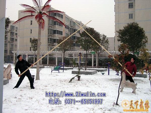 图17:大杆在太极拳中是提高太极功夫很好的辅助器械。拳谚讲“身体不整,用杆校”,亦说明大杆在太极拳中的重要性。(2008年1月郑州普降大雪,上述照片为雪中实景。)