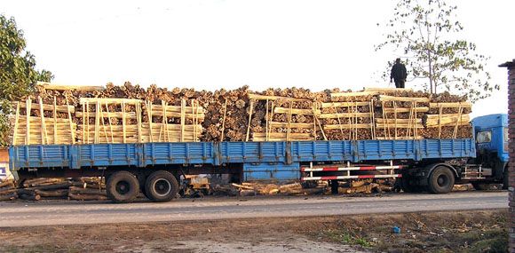 图:诚信铸就品牌,实力创造辉煌!我厂运输、出口满载白蜡杆车辆实景