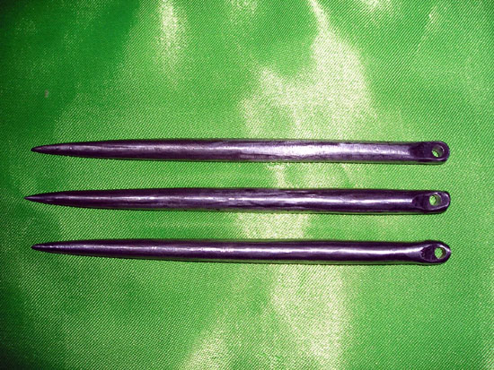 飞刺,长15厘米,最粗处8--9毫米,铁匠锻打,全钢,重一两.尾孔可穿绸布鼓风,也可不装,根据个人爱好.