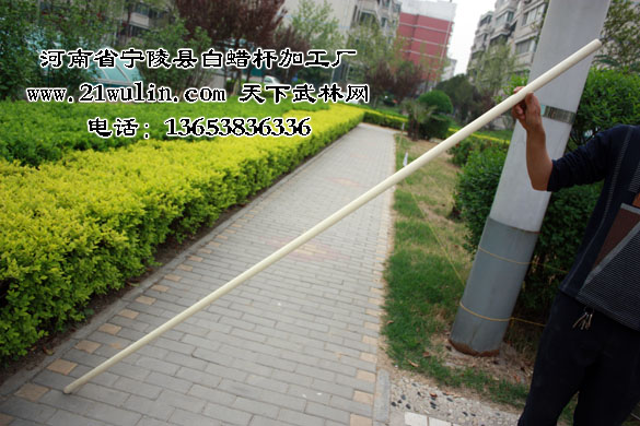 白蜡杆是天然绿色灌木丛生植物,它通体洁白、坚而不硬、柔而不折,杆身可弯曲到180度不劈裂,自身柔韧性强,纤维密度稠,有较强的自然拉力,在干燥的地方不劈裂,在潮湿的地方不变形,其弹性、韧性是其它木质不可比拟的,属绿色、天然、独特、稀有的特产,是加工武术器材及各种工具的理想天然原材料,深受国内外武术爱好者青睐。河南省宁陵县白蜡杆加工厂以“传统的工艺和先进的技术”为动力,充分利用这一独特资源的优势,把白蜡杆有弹性而折不断、有韧度而不变形、有力度而不震手等特性溶入技术开发中去,大胆采取高温熏蒸和现代工艺相结合的办法,彻底杀死深藏的蛀虫,精挑细选,精心加工后的杆子光滑锃亮、笔直成线。