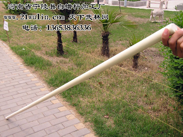 一、深加工武术棍系列介绍: 深加工武术棍系列是河南省宁陵县白蜡杆加工厂投资20余万采用日本进口高精度直线滚动导轨数控车床,选用优质上等白蜡杆为原材料,凭着一批敬业、经验丰富、技术精湛的生产队伍,做到产品不合格决不出厂,经高精度数控车床加工处量后,变成一条条洁白如玉、光滑锃亮、笔直成线的完美漂亮的武术杆,并充保持了白蜡杆本身所天然的"有弹性而折不断,有韧度却不变形,有力度而不震手"等柔而不折、坚而不硬的特色,是习武强身、参加大型武术比赛的好工具,也是店堂陈设、个人收藏的佳品,投产一月来已有万余根远销美国旧金山、日本大坂、新加坡、马来西亚、台湾等地,深受国内外武术爱好者青睐;河南省宁陵县白蜡杆加工厂,引领纯天然时尚,打造武术器械精品!