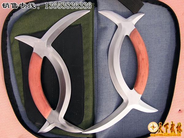 八卦子午鸳鸯钺:由清代董海川先辈所创,是八卦掌中的短器械。津门形意八卦泰斗——张占魁得传后,将此器械名日月乾坤剑,又名鹿角刀,一雌一雄,左钺为乾、右钺为坤,在八卦弧形圈中变化。 走闭开合,穿走九宫八卦。钺为六爪十四刃。此钺用法:钩挂擒拿、割拉、挑扎、闪展、劈剁、撩攒,穿翻截拦,步法的摆扣,钺内藏身,形成津门八卦子午鸳鸯钺特点 。