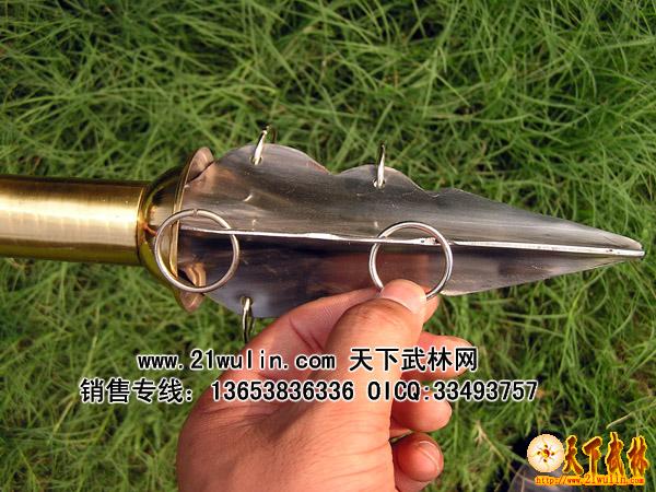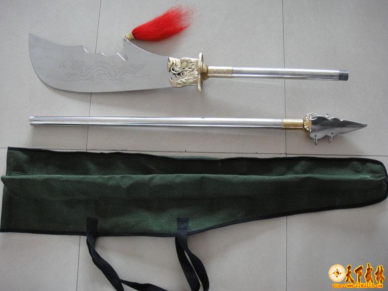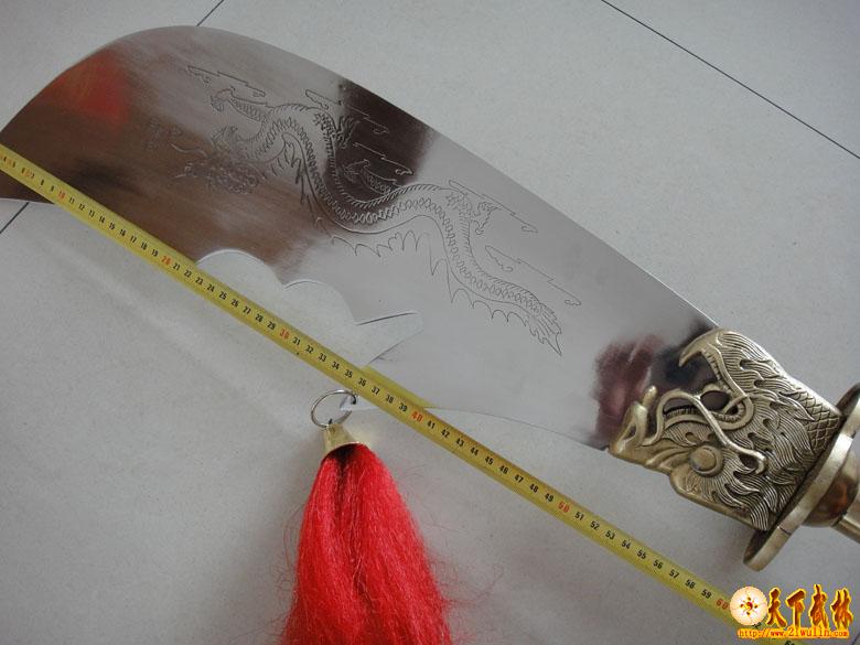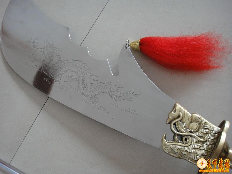 刀头、刀杆、刀尾采用不绣钢材质,刀杆中间打断,用套丝固定牢,刀头和刀杆连接处全部焊死外加铜箍包裹,全为一体,无论如何发力,刀头与刀杆的连接处不会动摇!纯手工制作,刀身上雕有龙,刀头有4-2毫米过渡,重心准确,分量适中,安装后无任何缝隙,质量上乘,外观精美,附送一个黑色皮革携带包,安装、携带极为方便,是练习武术、锻炼身体的好器械,也是店堂陈设、个人收藏的佳品。