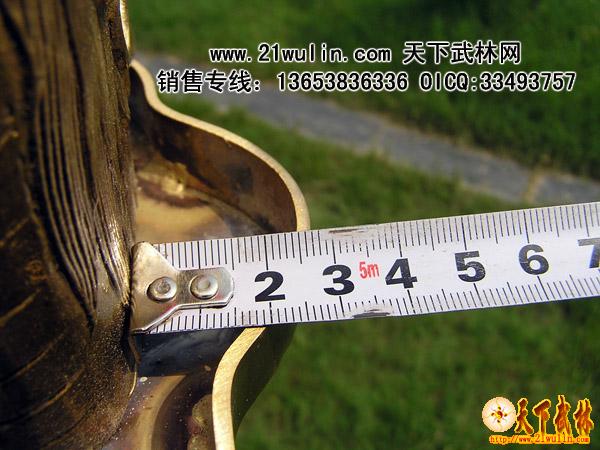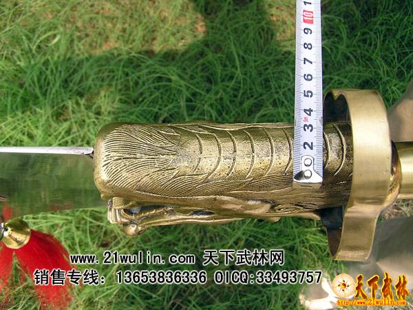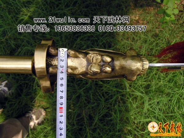 刀头、刀杆、刀尾采用不绣钢材质,刀杆中间打断,用套丝固定牢,刀头和刀杆连接处全部焊死外加铜箍包裹,全为一体,无论如何发力,刀头与刀杆的连接处不会动摇!纯手工制作,刀身上雕有龙,刀头有6-2毫米过渡,重心准确,分量适中,安装后无任何缝隙,质量上乘,外观精美,附送一个黑色皮革携带包,安装、携带极为方便,是练习武术、锻炼身体的好器械,也是店堂陈设、个人收藏的佳品。
