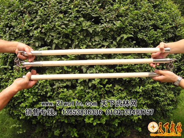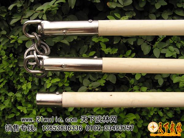 极品白蜡杆三节棍全景:选用宁陵正品白蜡杆具有坚而不硬、柔而不折、柔韧性强的等长白蜡杆做棍身,中间以不锈钢环连接而成。