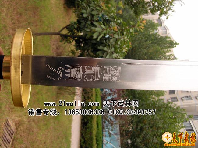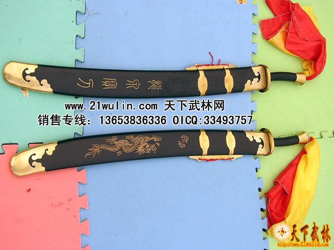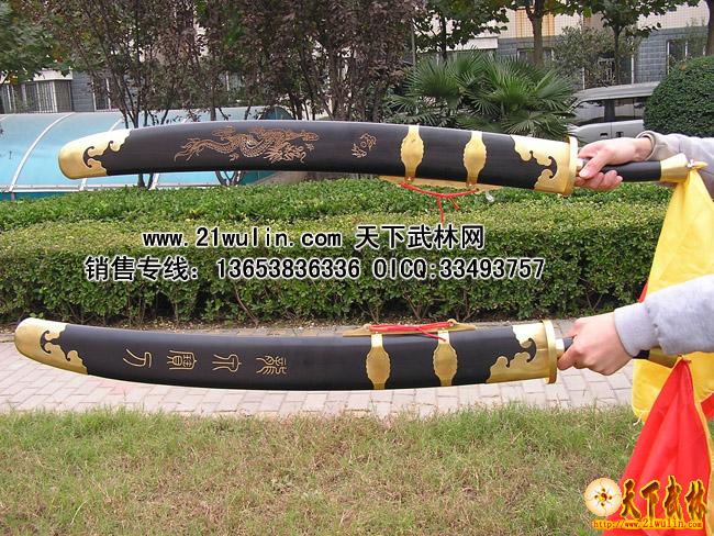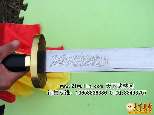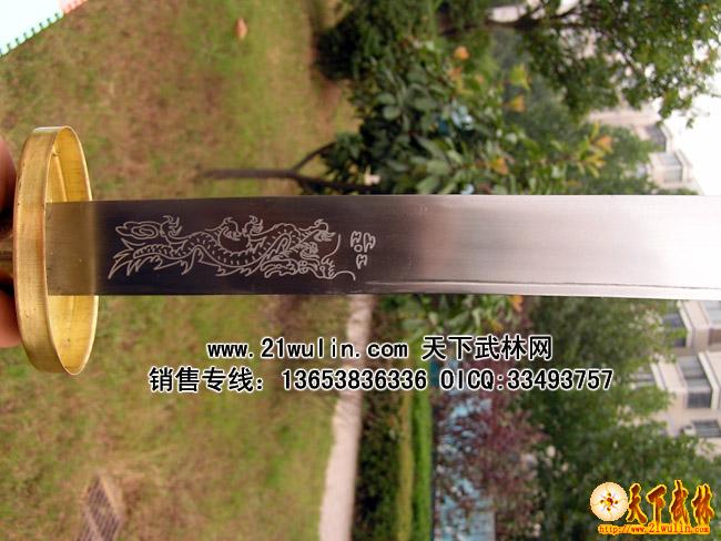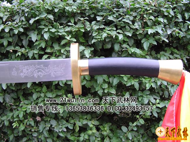 高碳钢加重型硬单刀侧面,手工雕刻“双龙戏珠”图案。
