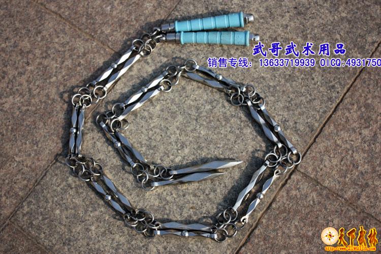 本款八棱九节鞭共分三种型号,做工、用料、造型、材质完全一样,请拳友根据自身喜好选择自己需要的型号: 1、八棱不锈钢九节鞭B型:重量1.5斤,鞭长150厘米,价格:260元/幅