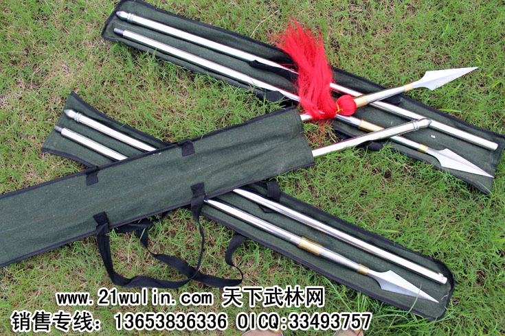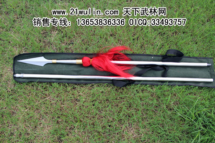 品名:折叠式全不锈钢武术枪全长:215厘米总重:4-5斤左右枪头长:35厘米枪头材料:纯不锈钢铜箍长度:4厘米枪头最宽度:5厘米枪后柄长:6厘米节数:可拆卸两节折叠后全长:110厘米枪管直径:2.5厘米枪管材料:全身不锈钢打造枪缨:双幅红色枪缨枪背包:加厚绿色帆布价格:260元