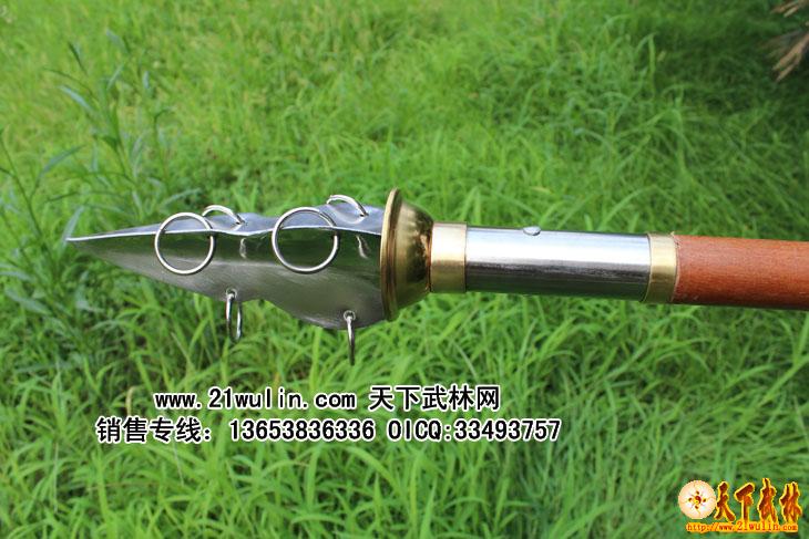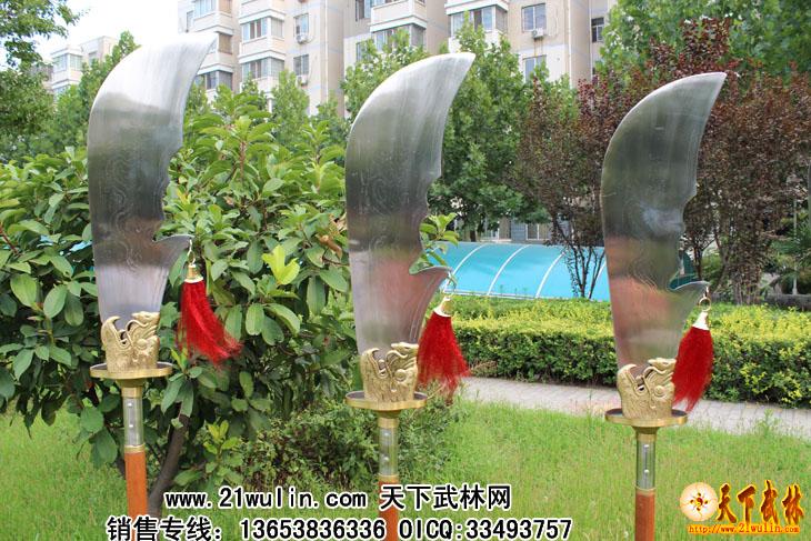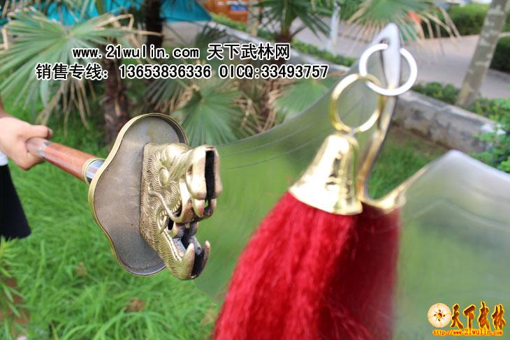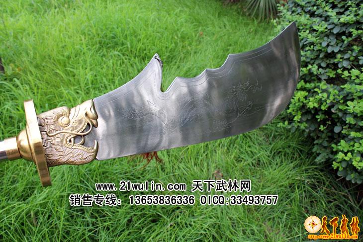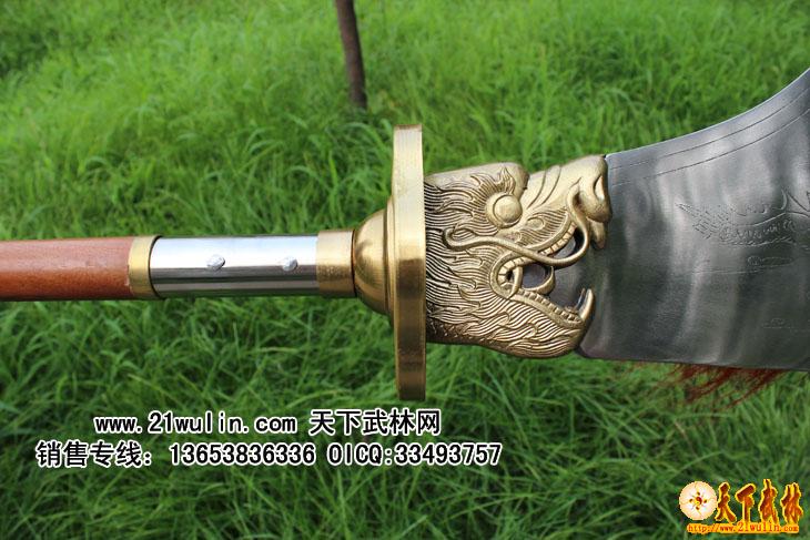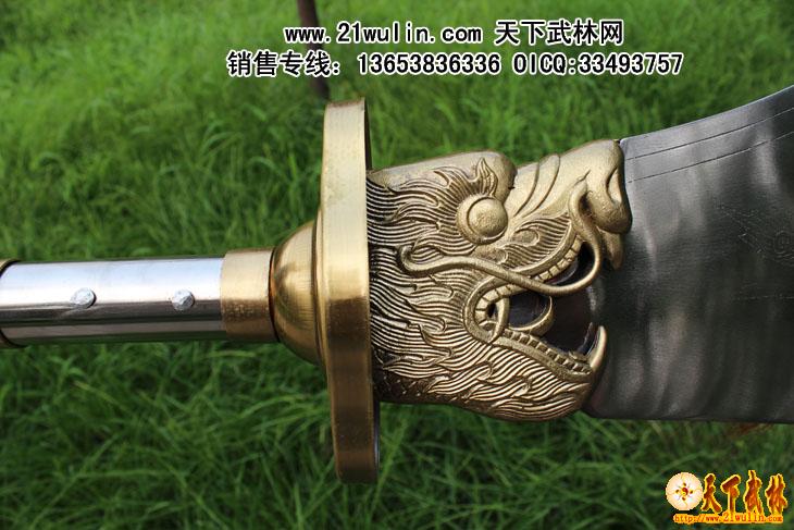 材质:全不锈钢 刀头、刀尾采用不绣钢材质,刀杆为菲律宾红木把,用套丝固定牢,刀头和刀杆连接处全部用铆钉外加铜箍包裹,全为一体,无论如何发力,刀头与刀杆的连接处不会动摇!纯手工制作,刀身上雕有龙,刀头有4-2毫米过渡,重心准确,分量适中,安装后无任何缝隙,质量上乘,外观精美,附送一个黑色皮革携带包,安装、携带极为方便,是练习武术、锻炼身体的好器械,也是店堂陈设、个人收藏的佳品。