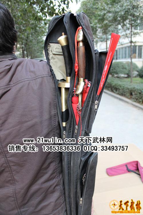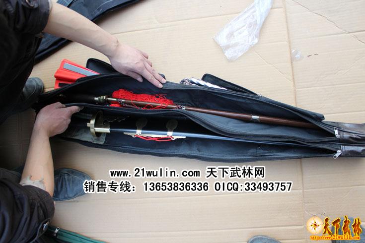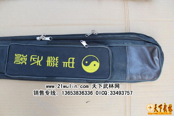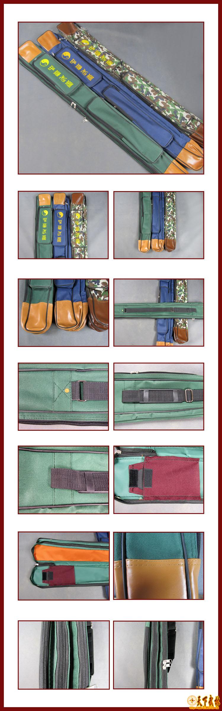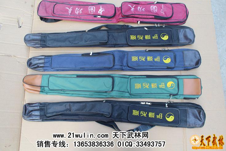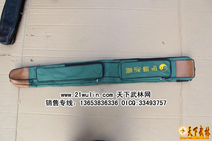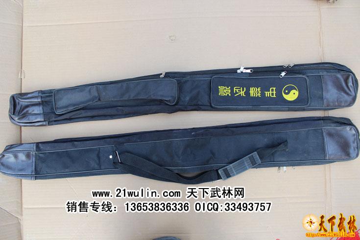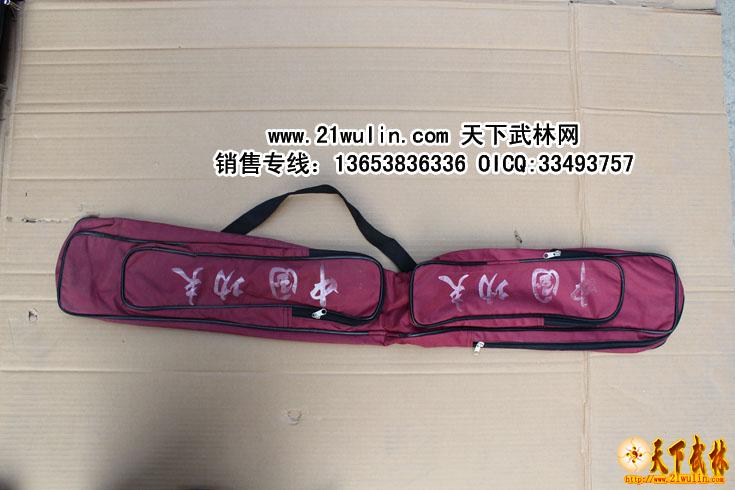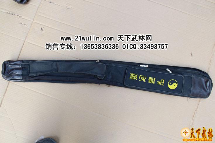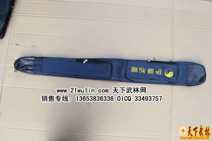 品名:太极剑剑套(刀剑包)规格:长108厘米左右 上宽11厘米 下宽7厘米 厚度10厘米重量:550g单位:个材质及说明 材质为加厚迷彩牛津布。里面可以装一把剑、一把刀,外面有两个小袋,可放小件物品如雨伞、双截棍、水杯、扇子等。