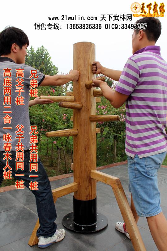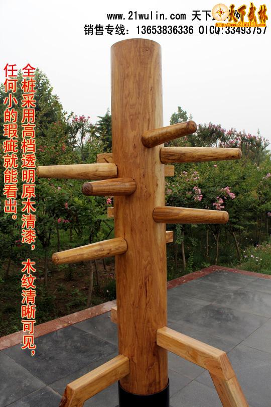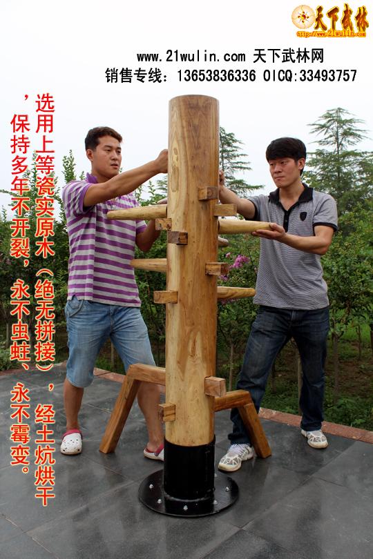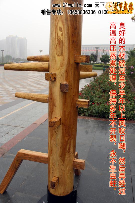 立柱式木人桩均由野生硬质木材(优质的槐木和榆木)精制而成,所有木材均经过微波干燥杀虫设备彻底烘干和杀虫处理,产品保证不开裂、不变形、不虫蛀。其造型美观,工艺精良,是武术爱好者的首选器材。木人桩是武术爱好者的练功对手和靶子,特别适合单人练习,能使使用者功力增进迅速,命中率和击打份量明显提高。是单人练功的必备器材。立柱式木人桩适用于地方狭小的室内安装,四角用膨胀螺栓固定在地面上。