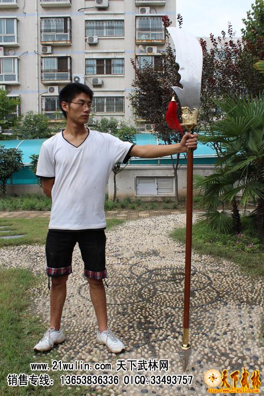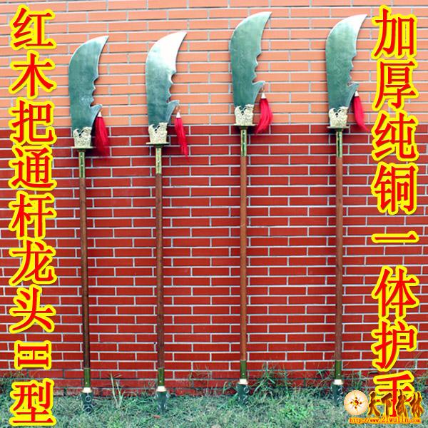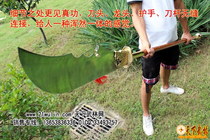 产品说明:本款春秋大刀采用不锈钢刀头,纯铜龙头护具,三道不锈钢铆钉固定,刀头、龙头、护手、刀杆无缝连接,给人一种浑然天成的感觉。此刀两端配重均匀,在中间处可以找到绝佳平横点,使用起来重心操控良好,力量分配匀称,刀杆采用进口菲律宾红木杆,永不变形,手握舒适,从用料设计到做工堪称完美,做工精细,栩栩如生,美观与实用并重,是不可多得的精品!