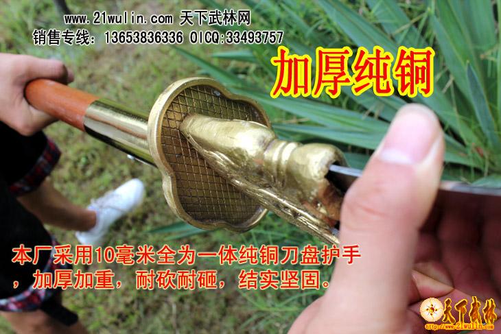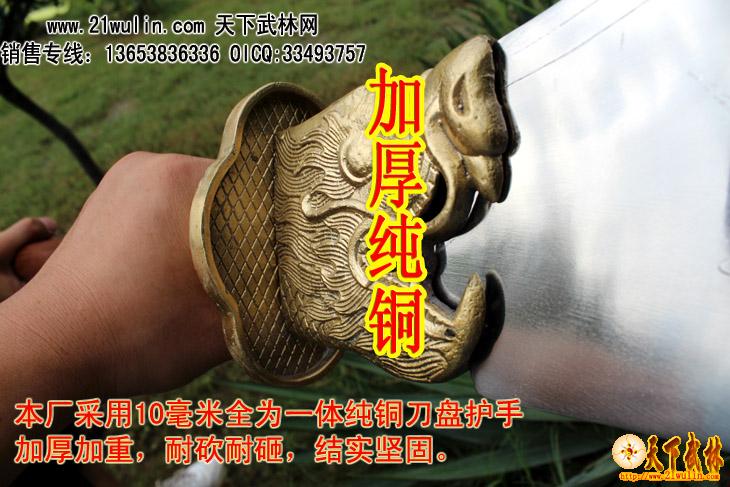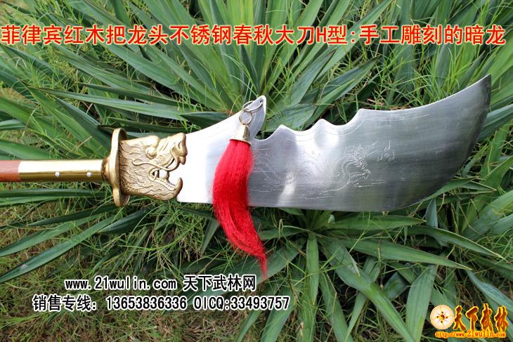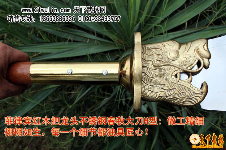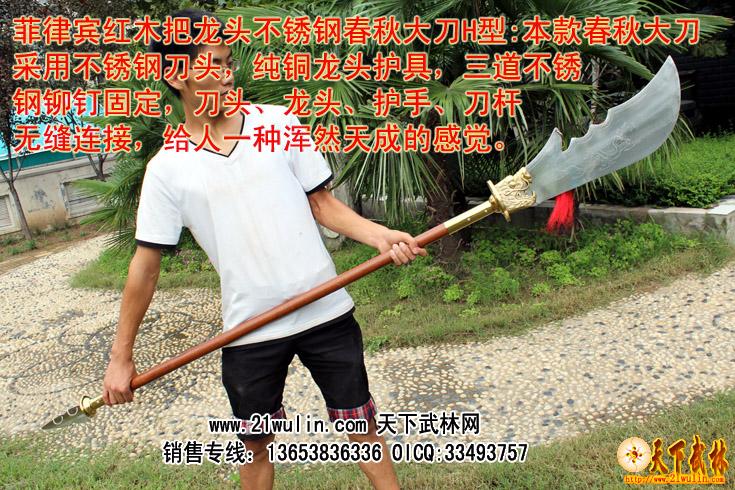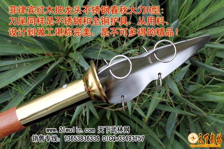红木把不锈钢龙头春秋大刀H型介绍: 参考尺寸 全长200-210cm [可以根据客户要求选定] 柄长145cm 柄径4.0cm 刃宽 8-25cm 刃长55-60cm 净重:6-7斤 ㊣≮刃材≯ 加厚高硬度不锈钢 ㊣≮柄材≯ 进口菲律宾红木杆,永不变形 ㊣≮柄护手≯10毫米加厚纯铜护手,纯手工打造全为一体纯铜刀盘护手 耐砍耐砸 ㊣≮工艺≯ 热出理、抛光、锻打 ㊣≮刀头与刀杆之间≯用铜环和三道不锈钢铆钉固定,结实牢固