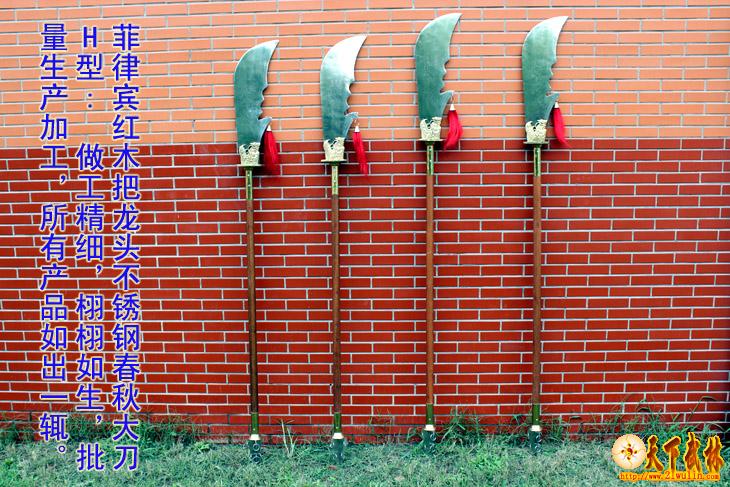 | 红木把不锈钢龙头春秋大刀H型介绍: 参考尺寸 全长200-210cm [可以根据客户要求选定] 柄长145cm 柄径4.0cm 刃宽 8-25cm 刃长55-60cm 净重:6-7斤 ㊣≮刃材≯ 加厚高硬度不锈钢 ㊣≮柄材≯ 进口菲律宾红木杆,永不变形 ㊣≮柄护手≯10毫米加厚纯铜护手,纯手工打造全为一体纯铜刀盘护手 耐砍耐砸 ㊣≮工艺≯ 热出理、抛光、锻打 ㊣≮刀头与刀杆之间≯用铜环和三道不锈钢铆钉固定,结实牢固