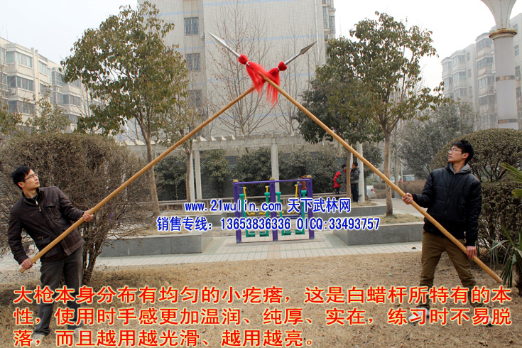 河南省宁陵县白蜡杆加工厂年加工各类白蜡杆在50万根以上,在用做武术器械中长年与各类武术院校及全国知名武术家建立良好的合作关系,宁陵白蜡杆武术棍(枪)的市场占有率在60%以上,其中长3至5米白蜡杆为太极大杆、抖杆、大枪等训练表演专用器械,独家生产的选用整段实木为源材料,全为一体、近乎正圆的纯实木实心太极球系列产品更是风靡武林,已有十多位武术名家在各类武术教学影片讲解演练中使用本产生产的武术器械,充分展示了我厂产品的一流品质。2006年邀请我国著名武术家、《中华武术展现工程》总监---武世俊大师为本厂形象代言人技术顾问、“第一、二届世界传统武术节”、“2007功夫之星全球电视大赛”为国家规定套路的棍术和枪术比赛专用器械、2008年春节晚会舞台上少林弟子使用本厂的武术棍,高难度的表演了“人在棍上翻”的动作给观众留下了深刻的印象,充分展现了白蜡杆坚而不硬、柔而不折的优良品质和我厂的雄厚实力!