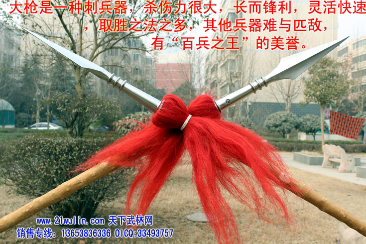 枪是军器里最博大精深的、最难学的。普通人拿根棒子就知道到处乱敲,给他根枪就不知道怎么办了。枪若使得好的,枪就好象有了生命-“枪似游龙”,古代骁将马踏连营之时,一条枪就把人马团团护住,枪头寒光到处,鬼哭狼嚎。
