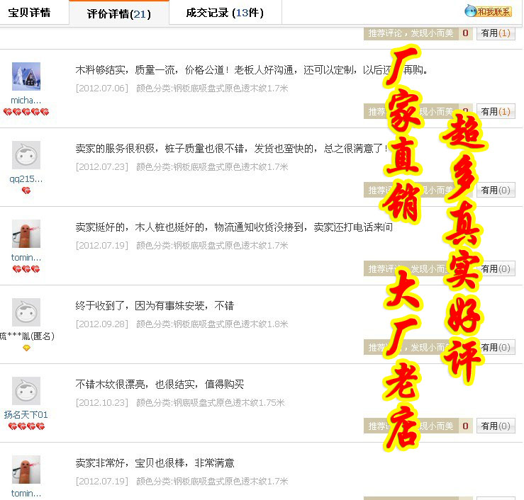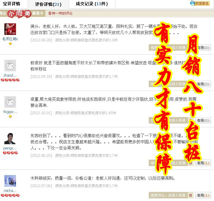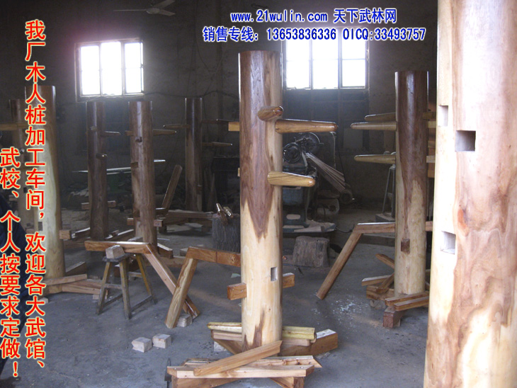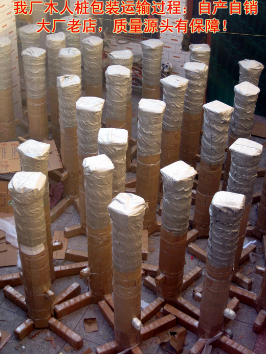 1、我公司木人桩为全手工制作,按现在的工钱和材料成本,利润空间不多,我们以质量求生存,同样式我们用最好的材料,所以我们不接受还价。 2、我公司聘用的工人都是有30年以上的老工人,有丰富的经验,可以说只要你能提供一个合理的样式图纸,我们的工人就可以给你做出来。所以,欢迎订做自己适合的桩。 3、我们使用的全部是高档的环保聚脂漆,所以,请不要拿他家的劣质货色跟我们的比价格。我们的油漆分1层底漆3遍面漆,由于是环保漆,所以木桩不会有一点点漆味!表面光亮,手感好也很上档次。并且保证绝不会大面积开裂! 4、桩身为原木,其它部位使用硬木,有时会选择不同木料。 5、如果没有特别要求,我们都按普通尺寸发货。