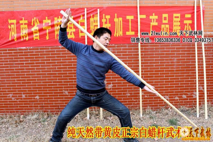 白蜡杆是天然绿色灌木丛生植物,它通体洁白、坚而不硬、柔而不折,杆身可弯曲到180度不劈裂,自身柔韧性强,纤维密度稠,有较强的自然拉力,在干燥的地方不劈裂,在潮湿的地方不变形,其弹性、韧性是其它木质不可比拟的,属绿色、天然、独特、稀有的特产,是加工武术器材及各种工具的理想天然原材料,深受国内外武术爱好者青睐。河南省宁陵县白蜡杆加工厂以“传统的工艺和先进的技术”为动力,充分利用这一独特资源的优势,把白蜡杆有弹性而折不断、有韧度而不变形、有力度而不震手等特性溶入技术开发中去,大胆采取高温熏蒸和现代工艺相结合的办法,彻底杀死深藏的蛀虫,精挑细选,精心加工后的杆子光滑锃亮、笔直成线。