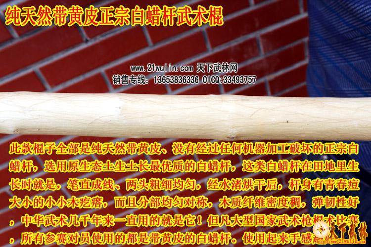 【此棍卖点】 1、白蜡杆材质制作,棍身纤维密度稠,其弹性、韧性、防震性能超强,坚而不硬、柔而不折,在干燥的地方不开裂,在潮湿的地方不变形。这方面是任何一种木质都不能与白蜡杆媲美的。 2、白蜡杆材质性能稳定,经水渚高温定型处理后,不燥不裂,免除后期保养烦恼。 3、经久耐用,越用越光滑、越用越亮,是练习、表演、比赛用棍首选。 4、白蜡杆棍还有一个优点,就是棍子用了一段时间会自然分泌蜡质,所以棍子越用会感觉质感越好。可贵的特质,望各位棍友多加留意。 5、河南省宁陵县白蜡杆加工厂--全国最大白蜡杆专业生产加工企业,大厂出品,做工精湛细致,质量源头有保证。