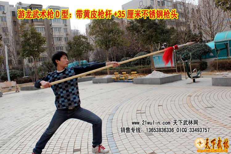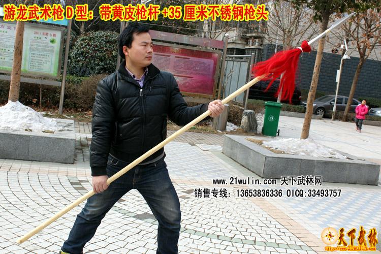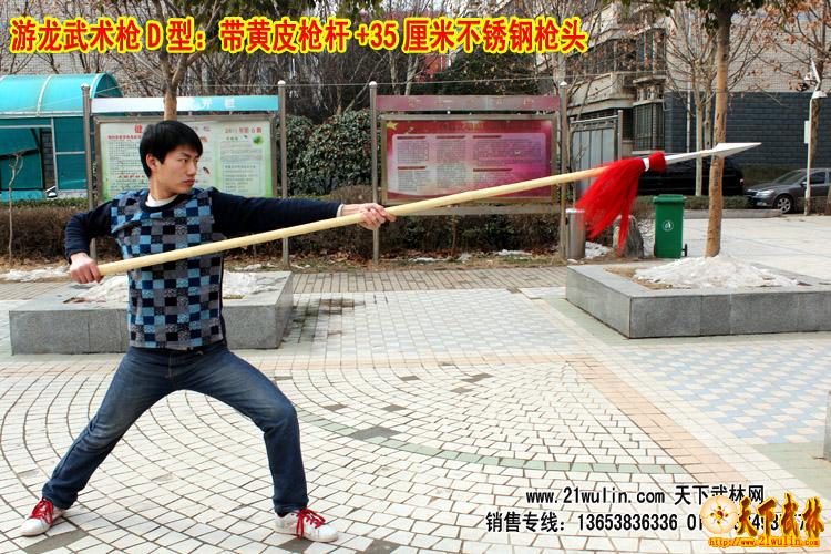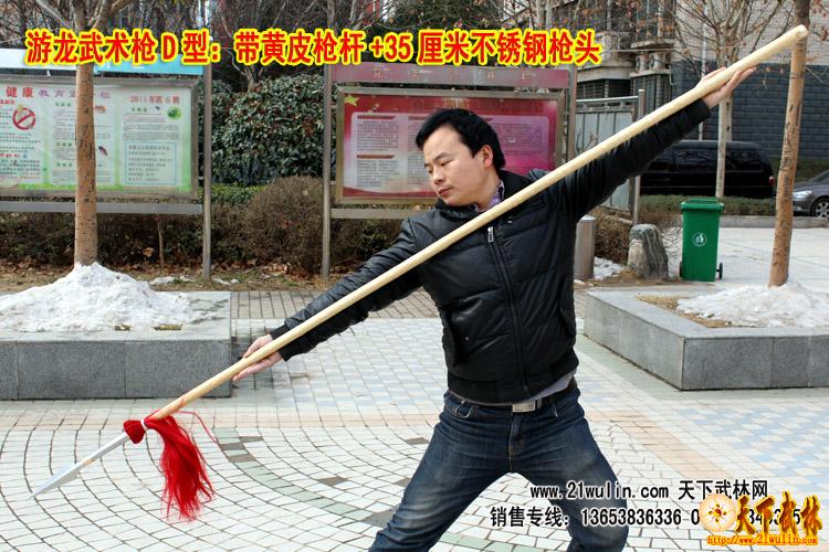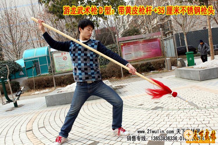 1、枪杆:游龙武术枪D型采用原生态土生土长白蜡杆材质,一头粗,另一头细,成圆锥型,杆身长有小大不等、分布不均、和青春痘大小的小小木疙瘩,充分保持了白蜡杆本身所天然的"有弹性而折不断,有韧度却不变形,有力度而不震手"等柔而不折、坚而不硬的特色,是做武术枪杆的绝佳源材料,中华武术几千年来一直用的就是它,从无替代,深受国内外武术爱好者青睐!