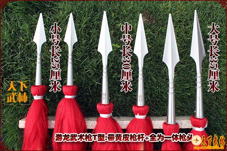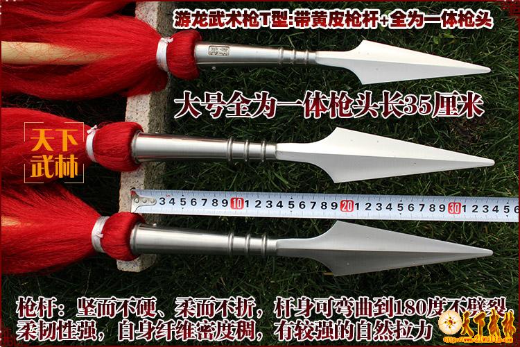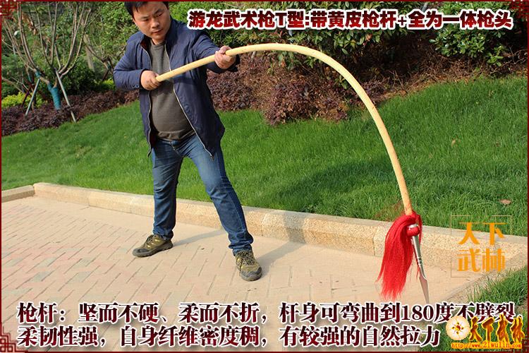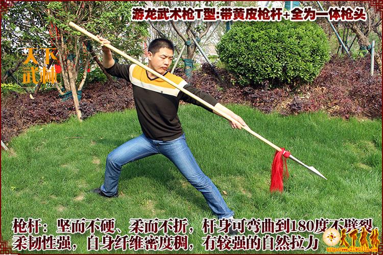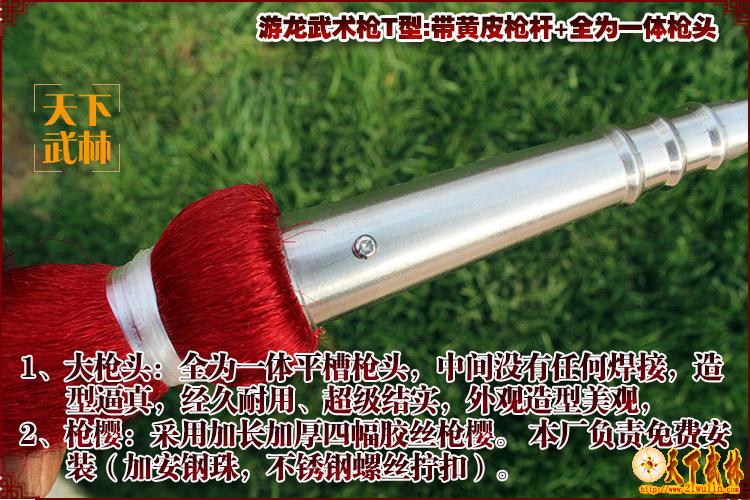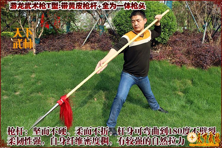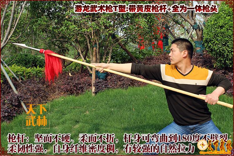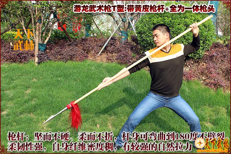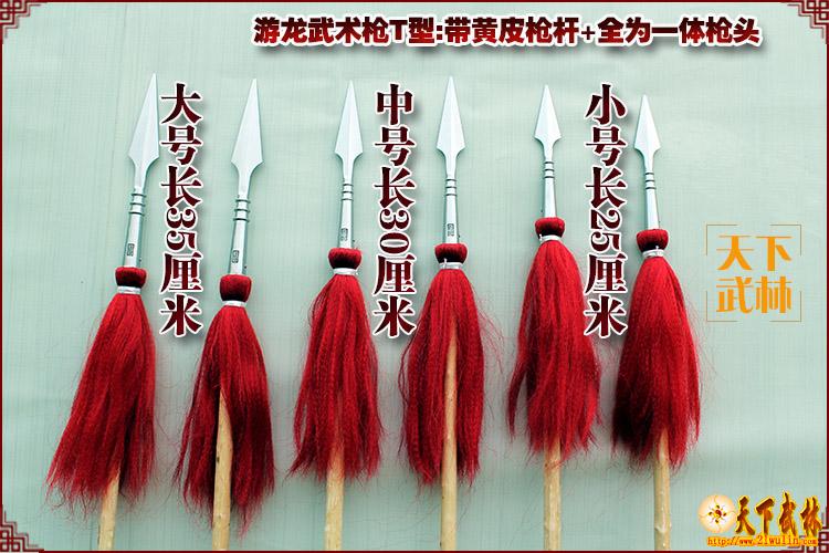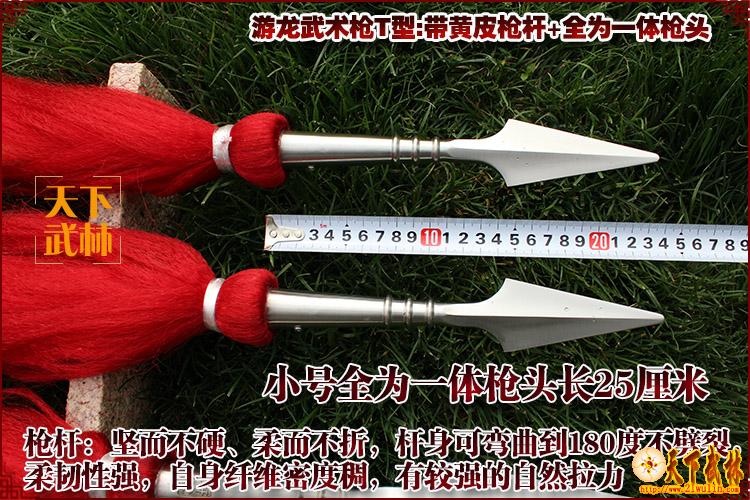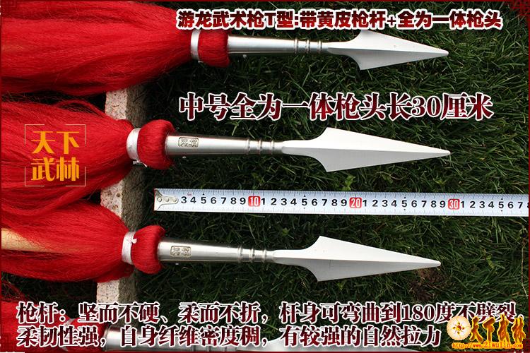 1、枪杆:游龙武术枪T型采用原生态土生土长白蜡杆材质,一头粗,另一头细,成圆锥型,杆身长有小大不等、分布不均、和青春痘大小的小小木疙瘩,充分保持了白蜡杆本身所天然的"有弹性而折不断,有韧度却不变形,有力度而不震手"等柔而不折、坚而不硬的特色,是做武术枪杆的绝佳源材料,中华武术几千年来一直用的就是它,从无替代,深受国内外武术爱好者青睐! 2、枪头:全不锈钢全为一体实心武术枪头(武术用品未开刃),长度分别为:25厘米、30厘米、35厘米,外观造型简洁大方美观,线形层次感强,枪头风格威风凛凛,典雅奢华、光彩照人,经久耐用、永不生锈。 3、枪缨:4幅加厚尼龙丝。颜色为红、白、黑,可任选其一。白蜡枪杆上挑朱红缨,挥舞之时红缨婆娑,令敌难辨枪矛之最终一击。 4、钢珠:为绿豆大小的铁砂,约10颗左右。 5、组装:本厂拥有5年以上武术枪安装经验的专业师亲自组装、结实牢固,做工精致。