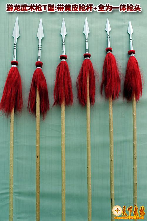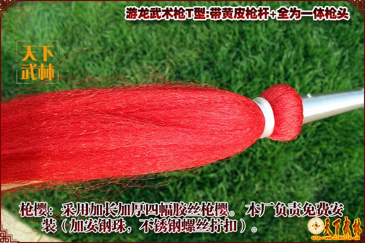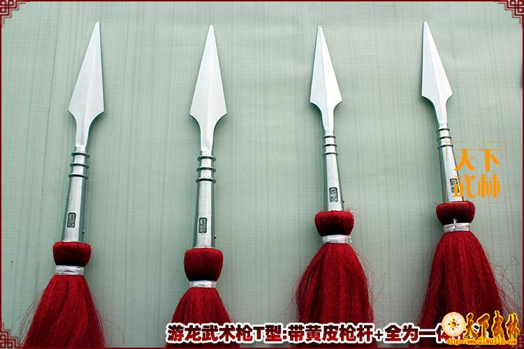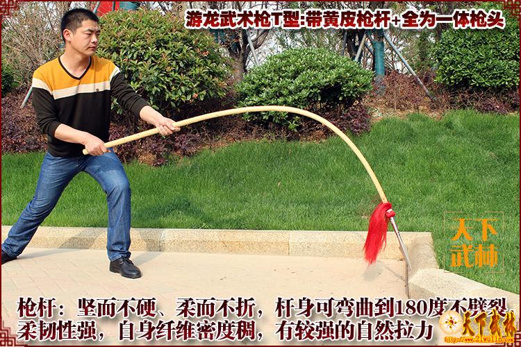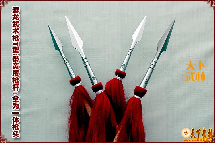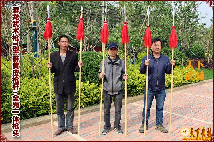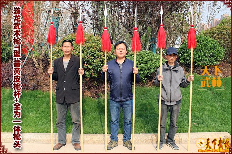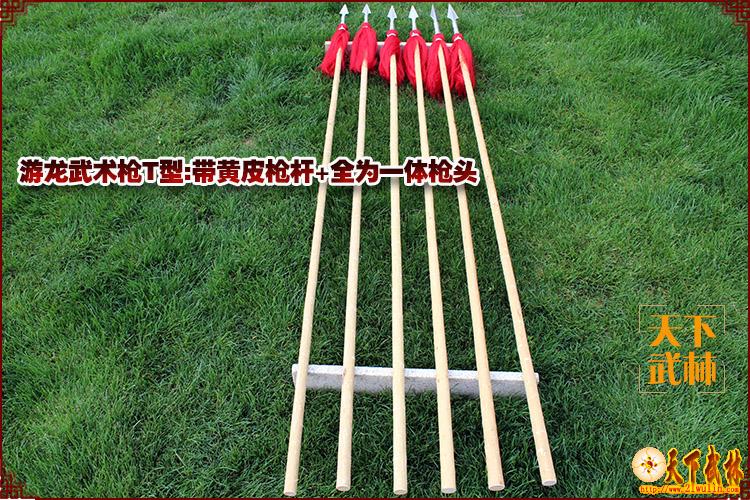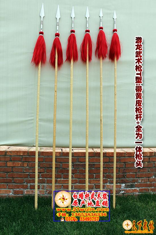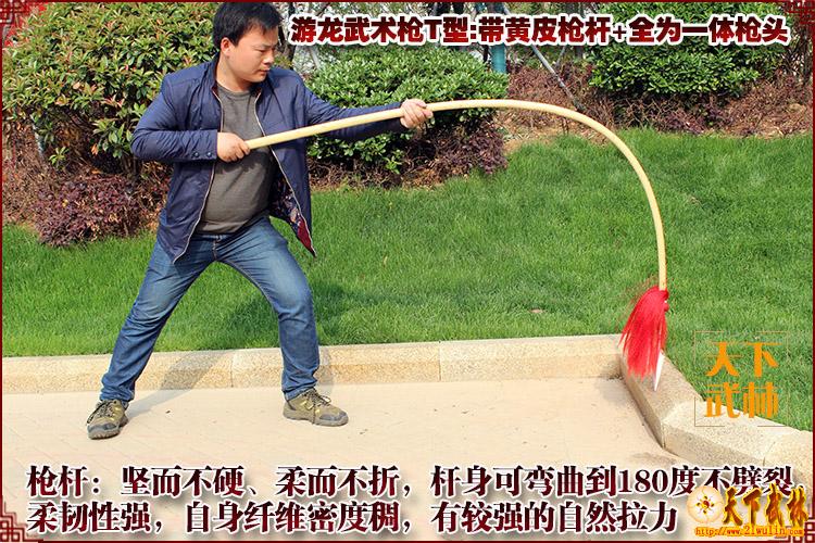 1、枪杆:游龙武术枪T型采用原生态土生土长白蜡杆材质,一头粗,另一头细,成圆锥型,杆身长有小大不等、分布不均、和青春痘大小的小小木疙瘩,充分保持了白蜡杆本身所天然的"有弹性而折不断,有韧度却不变形,有力度而不震手"等柔而不折、坚而不硬的特色,是做武术枪杆的绝佳源材料,中华武术几千年来一直用的就是它,从无替代,深受国内外武术爱好者青睐! 2、枪头:全不锈钢全为一体实心武术枪头(武术用品未开刃),长度分别为:25厘米、30厘米、35厘米,外观造型简洁大方美观,线形层次感强,枪头风格威风凛凛,典雅奢华、光彩照人,经久耐用、永不生锈。 3、枪缨:4幅加厚尼龙丝。颜色为红、白、黑,可任选其一。白蜡枪杆上挑朱红缨,挥舞之时红缨婆娑,令敌难辨枪矛之最终一击。 4、钢珠:为绿豆大小的铁砂,约10颗左右。 5、组装:本厂拥有5年以上武术枪安装经验的专业师亲自组装、结实牢固,做工精致。