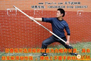 折叠式两头一样粗带棍尾白腊杆武术棍简介: 折叠式精加工两头一样粗带棍尾白腊杆武术棍,采用总长30厘米的两 个不锈钢套丝,将两根精加工两头一样粗的白腊杆连接在一起,棍头 两端用长5厘米全为一体不锈钢铸件做棍头,耐摔耐砸,棍头永不开 裂。所有棍子与不锈钢接触处