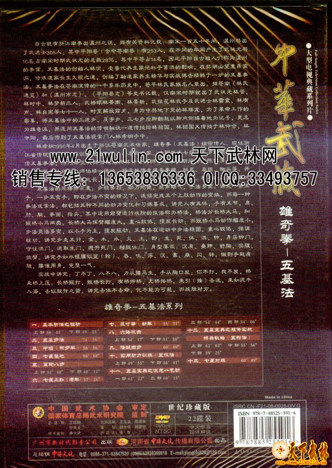 一、基本功法之桩劲 [2碟DVD]二、五其步法[1碟DVD]三、中坛(两步半)[1碟DVD]四、七星坠地[1碟DVD]五、变轮八步 [2碟DVD]六、七星上卦(老年)七、三寸拳[1碟DVD]八、六路攻击 [2碟DVD]九、隆焱四步[1碟DVD]十、实用功力训练(五技法) [2碟DVD]十一、五綦宝典之混无一气功 [4碟DVD]十二、五綦宝典之祖传实战搏杀秘籍(五形法) [3碟DVD]十三、七星对练 [1碟DVD]共22张dvd,全套共计660元