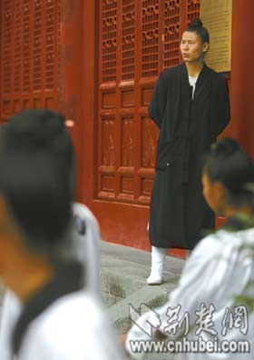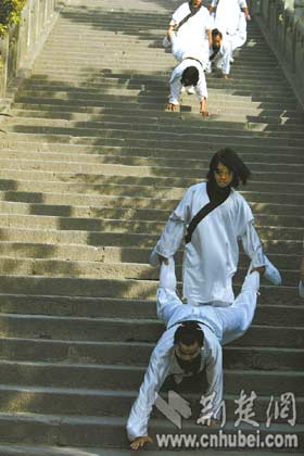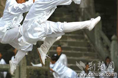 6月早晨的武当山,空气清新,是绝好的练武时间。紫霄宫内,大青石板铺成的广场上,整整齐齐地站着数十位身着白色道服的小伙子,他们就是中国武当功夫团的成员,年龄最大的30岁,最小的仅有10岁。个个身怀绝技,武道双修,其中还有武当内家拳第十五代嫡传弟子。