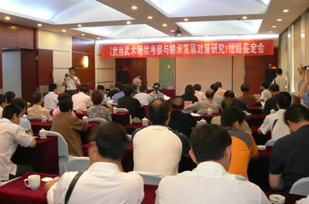 19日上午,国家体育总局武术研究院《武当武术现状考察与继承发展对策研究》课题成果,在武当山下十堰市美乐宾馆通过专家鉴定。会议由十堰市文化体育局局长赵国平主持,市委常委、宣传部部长冀群风致辞,市文化体育局副局长、课题组常务副组长王金国作课题工作总结报告,中国武术九段、课题组组长、武汉生物工程学院体育系主任江百龙教授、课题成员胡容娇宣读了45556字的论文,并用电脑放映视频解说和展示挖整资料等。十堰市人大副主任陈冬芝、市政协副主席、武当山道教协会会长李光富、武当山特区管委会主任李发平、市教育局、市科技局等单位有关负责人参加会议。课题组副组长、十堰市武协暨武当武术协会主席蓝继云和课题组成员及一些老拳师等近百人参加会议。