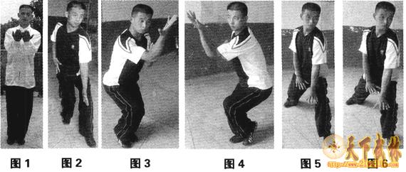 以上盘法可进步、退步、三角、S形、四面八方成随心所欲的不定法盘法为妙。收式用鹰捉(如图5)、虎扑(如图6)、雷声。