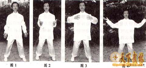 面向南方自然站立,两臂松垂于体侧。然后两脚左右分开,脚尖朝前,距如肩宽平行站立。浑身上下自然放松,在身形中正的基础上勿使一丝拙力,松腰顺脊,屈膝坐胯,目视前方。 心静神凝之后,两手臂外旋使掌心朝前,指尖向下置于两胯旁一两拳处,手心涵空,掌指自然变曲、微分(图1)。 意念:两脚人地,犹如松柏生根,头顶苍穹有冲天之势,这样就会自然做到顺项提顶,使百会穴、涌泉穴上下贯通。 意想两手劳宫穴(想面不想点)“吸气”将远方物体连基吸过来,略停,再用劳宫穴“呼气”将其推出(送回或推至远处)。劳宫穴“呼”、“吸”连绵不断,收放物体的距离也随次数的增加而加大。如此练习,有几个来回就会感觉足趾抓地,好像与地吸在了一起。 意念中物体的往复移动,如弹簧拉伸、筋条牵扯,松与紧的微妙变化、蓄与发的气力收放会自然形成。 行功中劳宫穴“呼”、“吸”时,身手随之微动属正常现象,此即“静中生动,动中寓静”也。但要自然而然,不可追求这种现象,以免误入歧途。