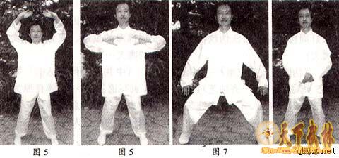 站式如前,两臂左右分开、手心朝上向两侧平举至肩高,两臂微曲,手心朝上,五指微分,虎口撑圆,掌心内涵,松们坠肘(图4)。 意念:双掌劳宫穴“吸气”,天下沉,重压手臂及两掌。意识不断,再用劳宫穴“呼气”将苍穹托起。 反复练习多遍时,由于劳宫穴的“呼吸”使掌心蠕动,掌指外顶 (特别是中指),要渐次增加顶力 (气行力到),次数间不可懈怠。双掌指顶胀,为气贯指梢(筋梢)之表现。