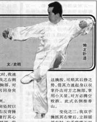 3、侧身压腕法:在临阵实战中,我以右式老僧托钵待敌时,突然进攻,速跃右步进左步,双手由上向下俯掌拍压其右臂,速以双扑推之势,撞打对方的胸部,对方必跌。此式名猛虎出洞。此式若对方用右顺拳击攻我中盘时,我可速摆右脚,进左脚于对方右脚后,以管套其右脚,使其不得退缩。于此同时,我速用双仰掌按压对方之右臂,以看其动静如何。其实我双掌一按压其臂,对方若一愣神,我立即乘机翻双掌推撞其右胸部,同时进左步跟右步,以助撞打之力。此又顺水推舟一变化。