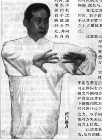 注意要点:此式侧身进步要快,左脚管套其右腿,使之不得回缩。抓腕、抓肘要准、要狠。整个动作要快速自然,上下连贯、协调一致,方可功成。