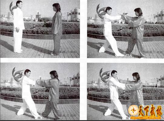 注意要点: 乙左脚上步要快而稳,保持身体平衡;左手向前推化与右手旋臂回抽要动作连贯,同时进行;且要把握时机,准确及时,力求解脱;否则,则受制于对方矣。 甲左手翻腕切拿与右手抱拿应动作连贯同时进行,且要顺对方推化之势,自然灵活;右上臂横切必须利用左转体拧腰转胯和左脚后撤之势,快速有力,一气呵成。整个动作须身步合一,手法准确及时,干脆利落,拧腰转胯,旋转自如;借势顺势,达四两拨千斤之效。 技法说明:怀中抱月属八卦门擒拿术中抱斫锁拿技法,此种技法变化灵活具有锁固之术,可制敌于无反抗之地,是八卦门擒拿术中的精华技法之一。下面笔者试举几例变化,以供读者参考。变化之一,当我左手反腕抓扣住对方左腕后,立即伸右手从对方左臂下向前反抓对方的左手使期左臂成反关节;同时急撤左步,出左膝成左弓步势,双手合力搬扣对方左手及腕,利用左转体拧腰转胯之势,右大臂紧贴靠对方左大臂用身体的整劲将对方擒败于我身体左前方,此即日月辉手法;亦可在左撤步的同时,左手从对方左臂下抓抱对方左手掌,双手合力向左下侧搬压,右大臂紧紧贴靠对方左大臂,右转体借拧腰转胯之势,将对方左臂折断,此即八卦擒拿术中之金勾挂玉瓶,亦可左手反腕抓扣住对方左腕后,反拧旋,使对方左臂成反关节,左手往左外侧推拉,右手立肘从对方左臂下伸出,以右小臂向右后方搬拉,左右手形成前后反方向力,左右交征,将方左臂折断,此即八卦擒拿术中之巧挎毛篮技法。 七、 外掰筋(金鸡点头) 1.紧接上式,乙见对方将自己左臂控制,并欲施术横切自己反关节时,急将右脚向前迈进一步以缓其势;同时,迅速用右手推化对方的右肘关节;左手旋臂回抽,前后交错,同时用力,以求解脱,目视对方面部(图15)。 2.紧接上式,甲见对方右手推化自己的右肘关节,急将右脚回撤于左脚前,势用右手引化对方的右手;同时,左脚向前上步,并借进步之势,迅速用左手由下向上翻拿对方的右手并向左外侧掰拿,使对方右臂成反关节势;右手掌心朝下,迅速向左横侧方搓击对方右掌外缘,力达双掌,使对方受制,目视前方(图16)。 注意要点: 乙在左手被控制后,立即向前进右脚,顺势缓解对方劲力;同时,借进步之势,立即用右手向前推化对方右肘。须掌握火侯。准确及时,且要灵活巧妙,随机应变,方可解脱;若动作迟缓僵硬,则受制于人矣。 甲右脚回撤与右手引化应同时进行,协调一致;左脚进步与左手翻拿须动作连贯,同时进行;右掌搓击须借左转体拧腰转胯之势,快速有力,直达对方右掌外缘,周身合一,劲猛力雄,自可一举奏效。 技法说明:外拜筋手法在八卦擒拿术中属挫折技法之一,此种技法劲力巧妙借劲打力,却非常狠毒,稍有不慎,即可将对方腕骨挫折断裂,故不可轻用。下面笔者试举几例其变化供读者参考:变化之一,当对方推我右手时我可右手顺势向对方头部右侧上钻穿,以化解对方的推力;左手继续拿住对方的右手向我的左下侧方搬拉;同时急起右脚迅速向前弹踢对方的裆部,此即八卦七十二招中的单蹄敬酒;变化之二:当我左手将对方右手反关节擒拿后,我立即伸右手由对方右臂下穿出,在自己左手上伸掌搬扣对方的右手掌内侧缘,双手将其右手腕扣紧,双臂像摇转车轮子一样划一个大园弧,边旋转边拉使对方肩肘关节受到强大的力量,尤其是肘关节,将受到巨大的伤害,此法为拆骨法之一,在八卦擒拿术中各之为旗悬太白。变化之三:汉我左手反关节拿住对方右手掌后,立即伸右手于对方右臂下,用右手掌扣抓住对方的右肘关节,左手向下搬拉,右手向上抓领,双手形成一圆弧运动,周身灵动,即可将对方制服;如果发力脆快可将对方右臂折断,此即八卦擒拿手上的旋转乾坤手法,非常凶猛凌励。 八、 弯弓射虎 1.紧接上式,乙见对方左手翻拿自己右手,又欲用右掌搓打时,急用左手向前推化对方的右腕;同时,右手内旋往回抽带,双手劲力相反,力求解脱,目视对方面部(图17)。 2.紧接上式,甲见对方左手推化自己右腕,立即顺势向回引化对方左手,并顺势由下向上翻打;同时,右脚迅速向前迈步对对方左侧;左转体,借进步拧腰转胯之势,左手同时用力向外掰拿对方的左掌;双臂上下划弧,力达双手,将对方制伏,目视对方面部(图18)。 3、乙方此时迅速顺其来势,右脚向前迈进一步,曲右膝成右弓步;同时,右转体,借拧腰转胯之势,右手臂顺势向对方身体的左后方上穿,以化解对方的反关节控制。此正如八卦实战四十八歌诀中所言:好拿怕穿顶。 注意要点: 乙在对方左手翻拿时,应迅速旋腕回抽;右转体,利用拧腰转胯之势,顺势用左手向前推化对方右腕;右手旋腕、左手推化应动作连贯,同时进行,力求脱解。 甲则利用右脚上步之势,右手顺势划弧向上翻打对方的头部耳门或太阳穴;左手则抓牢对方右手借左转体之腰力向下划弧外掰拿其右掌。整个动作须身步合一,双手划圆以指挥对方,配合协调,动作连贯,顺势借力,一气呵成,方可一举奏效。 技法说明:弯弓射虎在八卦门擒拿术中属拿打跌技法,此种技法是利用拧腰转胯和双手描太极相互结合之手法,使技法更加巧妙自然灵活,且变化多端。下面笔者试举几例变式供读者参考:变化之一,当对方推化我右手时我右手顺势手腕内旋绕开对方的推力,由胸前向对方的面门钻穿,当对方急用左手防护时,我左手释开其右手,走插花手,将对方左臂挑起,用右手推榻对方的左肋部位,发力刚脆,可使对方吐血