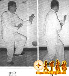 3、上势不停,两臂不动,腰身继续左拧,拧到极处时,不停,以身体向左的螺旋力自然带动左足碾旋提脚离地而起,形成左脚尖外摆,左膝外顶,左腿提膝,右腿独立承重的“青龙探爪”势。此时左臂之三节(肩、肘、手)与左腿之三节 (胯、膝、足)上下相照,浑身上下有蓄劲如张弓之势。头颈随势,眼神随掌,自然而然(图3)。