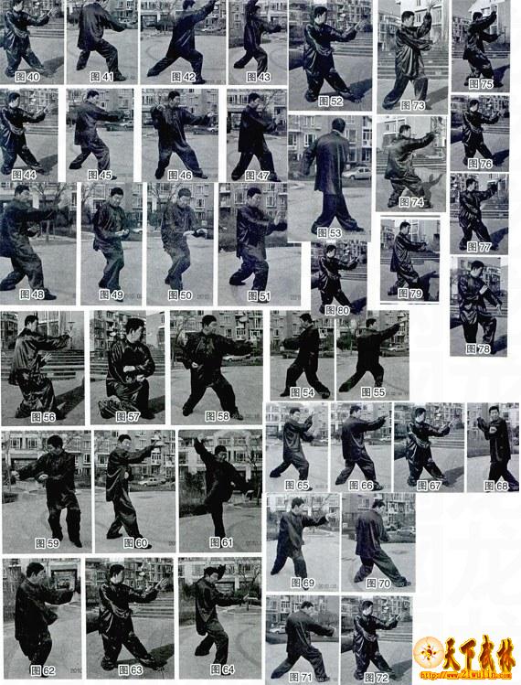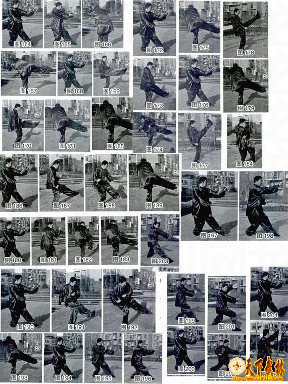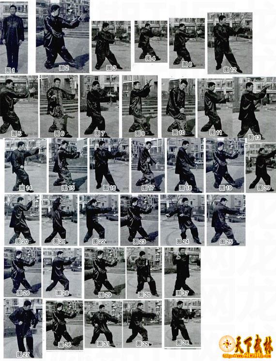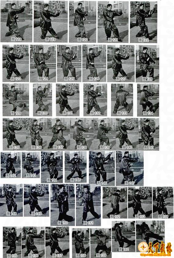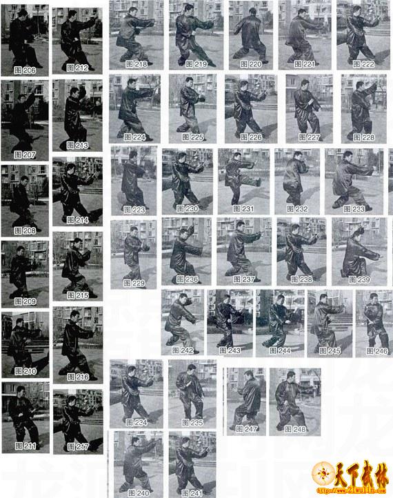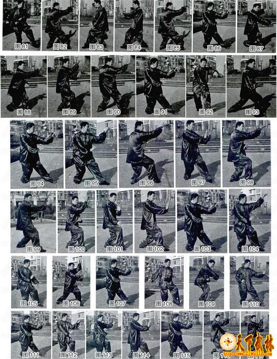 成式法:后天掌开式,左手在前。双手向后掳,栖身双带,进右步,右手盖面前门。左右相同,走直线。(如图23~图25)