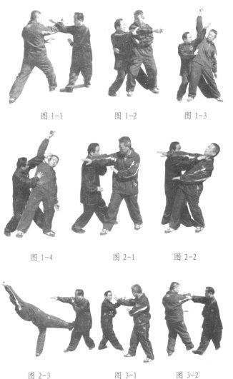 设对方(身穿运动服者,下同)上右步出右掌向我(身穿传统服装者,下同)击来,我速向对方右侧上右步外摆,同时起穿右掌,化开对方来势(图1-1),随即身体右转上左步内扣,置于对方左足后侧的同时,右掌内旋推对方右肘,左手向右腋下插伸手心向下,腰胯紧紧贴住对方(图1-2)。然后以左掌向斜上方外旋穿举,使对方处于不利状态(图卜3),同时拧腰吸胯,以左掌击打对方面部,右掌坐腕击打对方胸部(图卜4),左右式动作相同,唯方向相反。