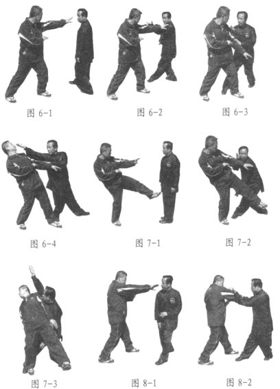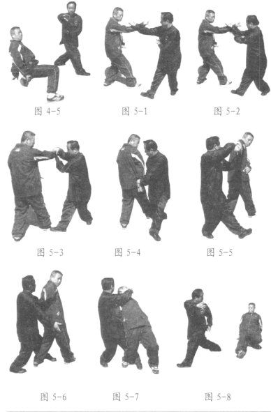 设我出右手穿击对方头面,对方起右手相迎(图5-1),我左掌从右肘下穿出,突抓对方右手腕脉门处(图5-2),用右手反抓对方右手(图5-3)的同时向左翻身,左足后插于对方右足后侧,我松开右手用右掌向我左后方击出,对方必旋转跌出(图5-4、5、6、7、8)。左右式动作相同,唯方向相反。