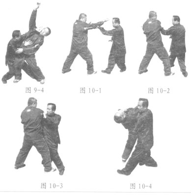 对方以右掌击我头部,我速掰右足出左掌,托截对方右肘,化开对方右掌(图10-1)的同时上右足内扣,右转身,左手向前继续推逼对方右肘(图10-2),随即再左转身向对方右足外侧上右步外掰,左手仍用力推住对方右肘,身体右侧与对方右侧贴近(图10-3),然后上右步出左掌下插对方腰部,右转身,右掌回扣对方面部,迫使对方向后倒地(图10-4)。左右式动作相同,唯方向相反。