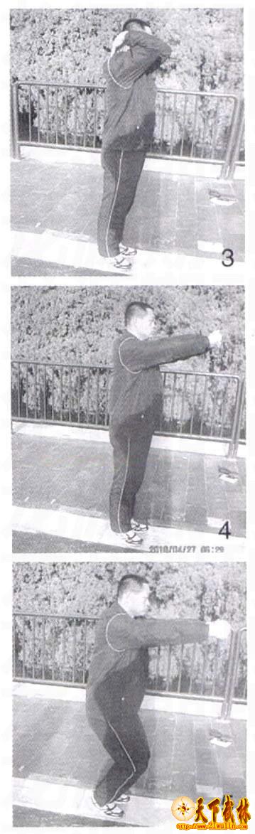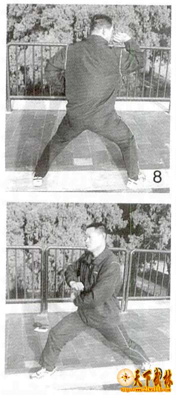 要点:转身要快要稳,利用腰的旋力带动身体。 30.退步掀胯 接上势,右脚向后退步,同时左脚也向后退,脚掌落地后仍然站成右弓步;右拳向前反砸出,左掌下按到小腹前护住腹部,眼向前看(图31)。 要点:八极拳可以前打、后打,也可以进步打、退步打。 31.翻身闲肘 接上势,身体突然向左转去,左腿屈膝,右腿蹬直成左弓步,在转身的同时,左臂屈肘,肘尖顶出,右臂顺势伸在右胯处,眼向左肘尖前看(图32)。 要点:突然向后回身,是为了防止后面的敌人从背后搂抱我。 32.挂耳 接上势,左拳变掌,左臂抬起,用左手掌顾住左太阳穴;右手仍置身后防止背后的攻击,眼向前看(图33)。 要点:因为武术中的肘打非要靠近敌人身体才行,但靠近了也有敌方突然用拳打击我的太阳穴的危险,因此,在回身打肘的同时,要用手挂耳,防止靠近我的一方打击我的太阳穴。 33.右打捋手 接上势,身体重心前移,全身力量移到左腿上,右脚向前踢出;两手放下,左手搭在右手腕处,在身体前面画一圆圈再到身体前面,眼看前方(图34)。 要点:此势是上下一起防备,上面接手下捋,下面脚踢或者截住敌人从下面的进攻。 34.金丝缠腕 接上势,右脚向前上步,落地后双手从身体左侧随转体向右面捋来,但是,两眼要向左面看(图35)。 要点:此为金丝缠腕,即敌方用拳向我打来,我用手缠住敌方的手腕然后用身体的力量向我右面转动,仍然用的是身力。 35.上步冲举 接上势,身体左转,重心前移,力量移到左腿上,右脚向前,落在左脚旁,与左脚并齐成并步,腿部微弯曲,成半下蹲形势,同时右拳向身体前面打出,拳眼在上,拳面在前;左手成掌,护在小腹旁;眼向前看(图36)。 要点:此势身体向左转身要极快,全身力量聚集在一起,向前冲打敌人。 36.退步冲掌 接上势,身体右转,右脚向右后退一步成马步,同时右肘后顶,左臂伸直,左掌向左方推出,掌心向左,五指向上,眼看左掌(图37)。 要点:马步要扎实,出掌要快。 37.上步抽掌 接上势,身体左转,重心移到左腿上,左掌挽手,右掌向前与左手相合,两手相合,能够增加手腕的力量,眼看左前方(图38)。 要点:假设敌方要是缠我左手腕,我则向左转身,左手攥拳,增加手腕的力量,再用右手与之相合,敌方虽然也缠住我的手腕,然我增加两手相合之力,敌方则无能为力。 38.歇步拽掌 接上势,身体重心后移,右脚落实,左脚向右腿后插去成歇步,左拳在身体前面,拳眼在上,右掌从左拳旁向身后捋去,眼看右面(图39)。 要点:左拳在左面支撑,右掌向右面撩打。 39.翻身撩掌 接上势,左脚踏地踩实以后,右脚向身后上一步,落地后屈膝成右弓步;左腿在后挺直;右手在身体前面自右向左再向右画一圆圈,左拳在身体后面支撑;右掌心向前,五指向上,虎口在左;左手拳眼向身体,拳面向下;眼向前看(图40)。 要点:身体转动要灵活,不能呆板,实际是右手在身体前面顾打一周。 40.左金丝缠腕 接上势,身体向左转,左手拳变掌,用掌捋,右手掌握住左手腕向左下缠下,身体转成左弓步,眼向身后(现为左前方)看去(图41)。 要点:转身要快、要稳,防守或者进攻的意识要强。 41.上步冲拳 接上势,右脚调步,向前上步,左脚跟上,腿部挺直成右弓步;右手下捋,左拳从左胯部向前打冲拳,拳眼在上,拳面在前,眼向前看(图42)。 要点:上势是抓住敌腕,敌方必然向后挣脱,我则随之转身突然打出左拳,击打敌人。 42.马步冲捶 接上势,身体左转,成马步,左拳后带,随之打右拳,拳眼在上,拳面在前,左肘后顶,左拳置左腰间,拳眼在上,拳面在下,眼看前方(图43)。 要点:随腰动而出拳,其力是身力,其大无比。 43.白蛇吐芯 接上势,身体重心后移,右脚提起,向上贯膝,同时右拳变掌,掌心向上,五指向前,左手掌置左胯处,掌心向下,虎口在里;眼看右掌前方(图44)。 要点:上势冲捶后,假设敌方用脚踢我右腿,我则提膝让过敌方的进攻,用右手变掌用五指前戳敌方眼睛。 44.上步穿袖 接上势,提起的右脚向前上一步落下,再提左脚,同时左掌从右掌上面向前穿刺,掌心向上,五指向前,右掌向右胯旁落去,眼看左掌前方(图45)。 要点:此势只是换腿站立而已,但换手一方面是卸敌方的力量,另一方面是增强我的攻击力量。 45.上步勾打 接上势,左脚向前上步,落地后屈膝成左弓步,右腿在后挺直;同时,右手向身体右面穿击过去,左手从右臂上穿过后向前勾手再向前推掌(图46)。此图是动作的反面,练者要注意! 要点:上步要快,落地后五趾抓地要牢,手臂伸直,掌根用力。 46.翻掌显胯 接上势,身体重心后移,左腿弯曲,成右虚步;左手翻掌成掌心向上,五指向前,右手掌心向下,五指也向前,按在右胯旁,眼前视。(图47)。 要点:此势是待敌之势,攻可进,退可守。 47.退步勾打 接上势,右腿向后挂,重心在腿上,左腿屈膝,右腿挺直成左弓步;左手向后勾手,右手成掌向前推出,眼向前看(图48)。 要点:此势为挂塌势,不光可以前后挂,还可以左右挂,也是八极拳中的一种摔法。 48.两仪顶肘 接上势,身体重心后移,身体左转,左脚向右后移去,两脚站立成马步;同时,左臂屈肘,向上抬起,拳置左腮旁,手心向上,虎口在下;右臂向右甩去,臂伸直,右拳向右砸去,拳眼在下,拳面向前,眼向左肘前看(图49)。 要点:此势只是肘顶,与前面的两仪肘相比稍有变化。 49.怀抱婴儿 接前势,右脚向左脚靠去,两脚相并,左肘翻肘穿击下,拳到裆部;右臂屈肘,前臂横在身体前面,拳眼在下,手心向前,两眼向前平视(图50)。 要点:收势时要不急不躁,不慌不忙,沉着稳定。就像平