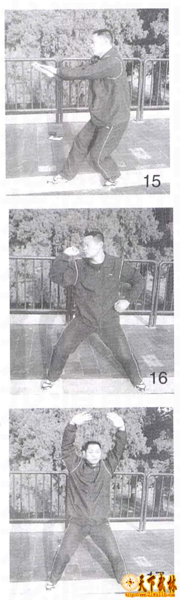 要点:身体向右转体,臀部微坐,上身保持正直,力点在左腿上。 15.两仪顶肘 接上势,身体左转,右脚上前横摆微扣,两膝均弯曲,站成马步;右臂屈肘随转体向左打去,右手攥成马蹄掌,掌心向上,虎口在下;左臂屈肘向左拉去,成两仪肘;眼向右肘前看(图16)。 要点:两仪肘在八极拳中属于经典动作,有“怀抱婴儿肘托山”之称。其用途也广,练习者不可轻视。 16.霸王举鼎 接上势,原马步不变,双手从下向上一起举起,两掌心向上,就像霸王双手托起千斤重的大鼎一样,有霸王的“力拔山兮气盖世”的英雄气概。双手高举,眼观六路,耳听八方(图17)。 要点:八极拳猛打猛冲,刚猛爆烈,是中华武术中不可多得的好拳种,练时要用英雄气概来增强动作的气势和力量。 17.马步双捶 接上势,原站马步不动,双掌握拳,从上放下,再双拳一起向身前打出;拳心均向上,虎口向外,眼看身体前方(图18)。 要点:双拳从上砸下要像霸王举起的千斤大鼎从空中落下一样,气势威猛。 18.马步勒肘 接上势,原站马步不变,双拳从身体前面屈肘收拳,两拳心向上,虎口在外,头颈竖起,眼向前看(图19)。 要点:步形不变,全身的力量不变,精、气、神不泄。 19.马步揣裆 接上势,身体步形不变,臀部后坐,两腿稍稍弯曲,双拳从上向下经大腿内侧往裆里揣下,双拳拳眼向里,眼看前方(图20)。 要点:也有把此势叫做“揣裆”的。双拳放在裆里的大腿内侧,防止敌人向我裆部进攻。 20.冲天炮 接上势,身体右转,重心移在左腿上,右脚在前成虚步;右腿稍弯曲,左膝弯曲成右鸡步,同时右拳翻拳向下,向身体右侧砸去,手心向上;左拳变掌放在小腹前,护住腹部,眼向右拳前看(图21)。 要点:此势是用右拳反手背砸下,左拳顾在右肋下防守。 21.上步挖眉 接上势,右手后带,左掌向前刺去,掌心向下,五指向前,身体向右转腰,右肘尖后顶;两眼向前方看去(图22)。 要点:此势是利用腰的旋转带动手臂向前刺击。 22.马步推掌 接上势,身体右转,左脚向前上步,落地后站成马步,同时,左掌立起,掌心向前,五指斜向上,头面向左,眼看左掌前方(图23)。 要点:此势也是随身体转动而向前推掌,用的身体力量而不光是手臂之力。 23.推窗势 接上势,身体向左转,右脚向前上步,落地后与左脚一起成并步,左掌回捋,右掌向前向下推掌,眼看前下方(图24)。 要点:此势身体左转,右手前下推,要用丹田小腹之力。 24.迎风朝阳 接上势,左脚向前上步,落地后成马步;同时,右手掌从前向右后带,掌心向前,五指向上,虎口在里;同时,左掌向身体左面推去,掌心向着自己,五指向上,眼看左掌前方(图25)。
