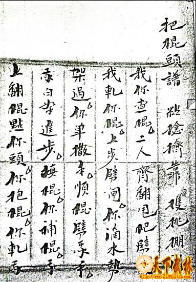 把棍头具体的招势很多,诸如:花子寻门、插花、劈砸、滴水、轧棍、填棍、点棍、跨马棍,砸跪膝、白猿托刀、白马回头、花郎寻梅等。还有先师讲的“涮”棍,《罗疃谱》写作“顺”棍,我觉得写作“甩”棍也很形象。因为方言口语的原因,我不确定是哪个字。这是一种迅速以两手握住棍的一端,将另一端直线或斜线击出,力在彼端的招法。你看,握住棍的一头,顺达地将力贯到另一头,是不是写成顺、涮、甩都有道理呢。
