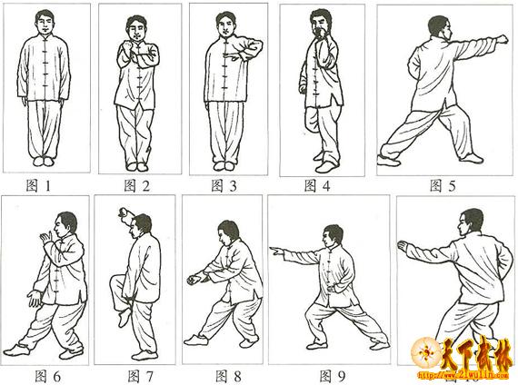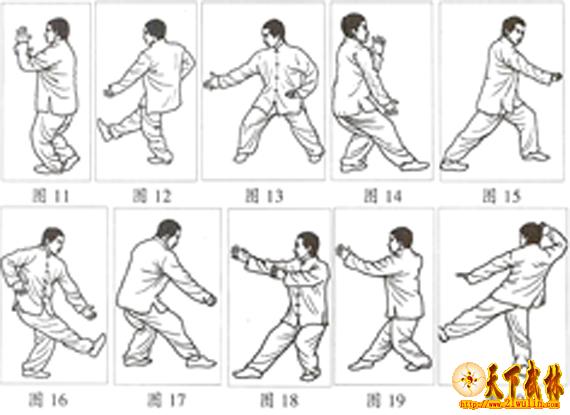 动作要点:动作连贯,发力要猛,右掌前击,力达掌根,可发声以助拳威。